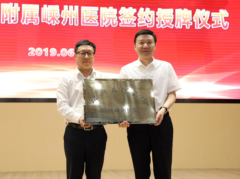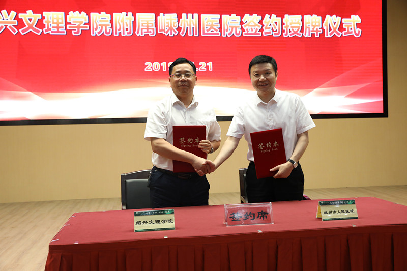 柳国庆与吴建平分别代表学校和医院签订《新葡的京集团350vip8888官网与嵊州市人民医院关于挂牌新葡的京集团350vip8888官网附属嵊州医院协议书》。