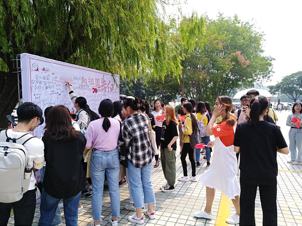 绍兴晚报总编杨燕萍女士在“向祖国告白”墙上领笔,带领大家签字告白祝福祖国。学院青年学子们用最青春的语言、最由衷的祝福、最深情的告白向党、祖国和学校表达坚定理想信念,抒发爱党、爱国、爱校的奋斗之志。