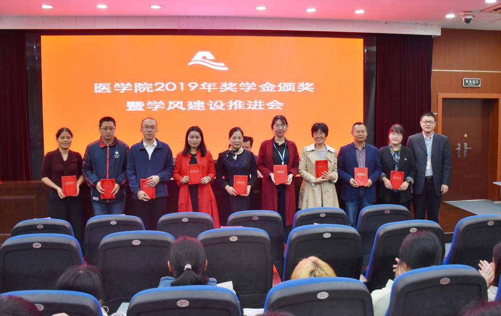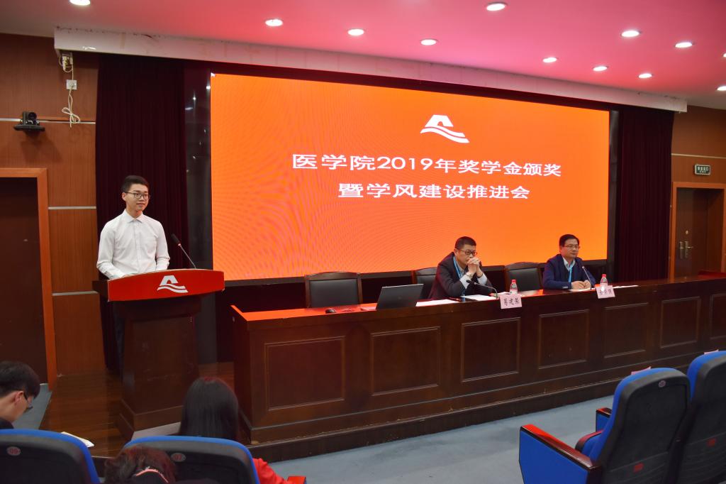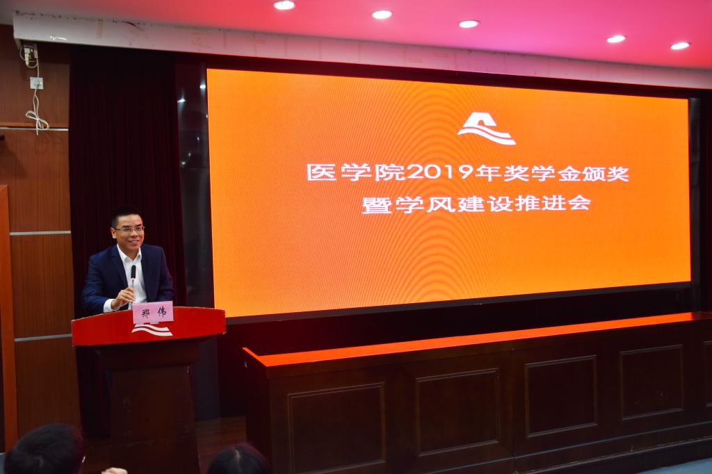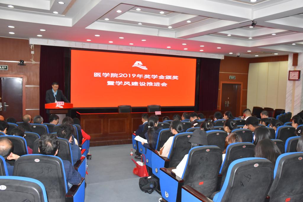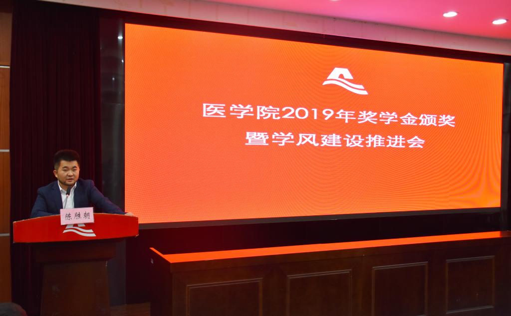 10月30日下午,学院举行2019年奖学金颁奖暨学风建设推进会。院党委书记夏瑞明、院常务副院长葛建荣、校对外联络处副处长夏婷,“金域奖学金”设立单位杭州金域医学检验所有限公司总经理郑伟、副总经理祝宇翀、营销总监黄桂根、总经理助理罗伟良、行政人力资源部招聘主管王红妹,“明峰奖学金”设立单位明峰医疗系统股份有限公司副总经理、明峰医疗设备有限公司总经理陈胜朝、明峰医疗系统股份有限公司绍兴区域经理孟飞烽,学院系部主任、书记、班主任、辅导员代表、获奖学生代表及在校主要学生干部参加。活动由院党委副书记金坚强主持。