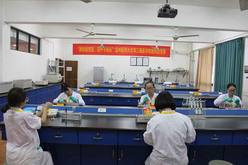 本次竞赛由温州医科大学检验新葡的京集团350vip8888官网、生命科学学院主办,浙江中医药大学医学技术学院、新葡的京集团350vip8888官网医学检验系协办。竞赛旨在培养医学检验技术专业大学生的社会责任感、创新意识、团队精神和实践能力,增强医学检验技术本科专业学生之间的沟通和交流。其它参赛团队包括温州医科大学和温医大仁济学院全日制2015级医学检验技术,2016、2017级医学检验专升本学生;浙江中医药大学2015级检验技术专业学生等,共计60人组成的12支队伍。竞赛分为个人赛和团队赛,内容涵盖临床生物化学检验、临床免疫学检验、临床微生物学检验、临床基础检验和临床血液学检验等科目,根据考核内容分为5个考核站点,其中1个站点考形态学图片识别,其余4个站点分别考1项技能操作。