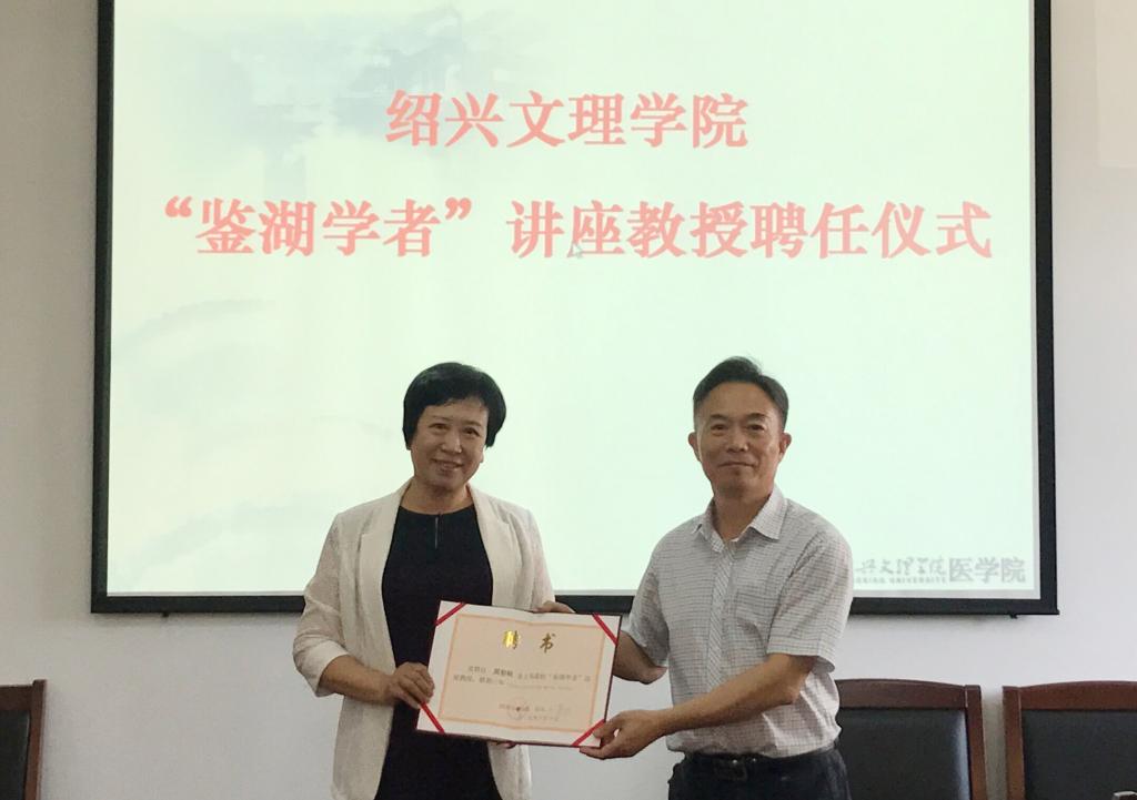 唐和祥副书记为周郁秋教授颁发新葡的京集团350vip8888官网“鉴湖学者”讲座教授聘书,并合影留念。