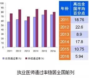 (3)执业医师通过率高 连续六届毕业生国家执业医师考试通过率远高出全国平均水平,在省内同类院校中名列前茅。