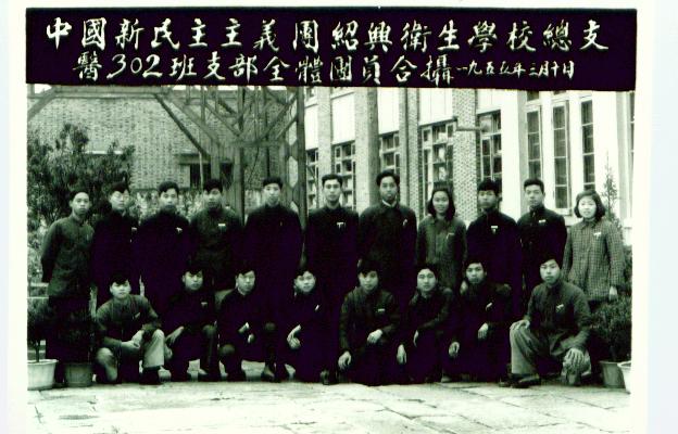 绍卫医士302班团支部全体团员毕业前与第2任班主任解保康(后排右5)留影(1955.2)