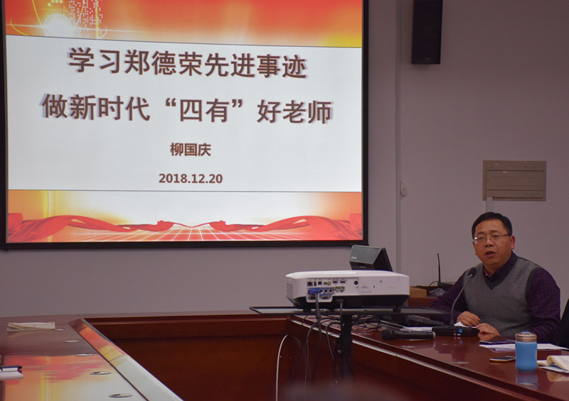 随后,柳国庆副校长作题为《学郑德荣先进事迹,做新时代“四有”好教师》的主题报告,从坚定的理想信念、卓越的学术成就、高尚的师德情操、高洁的品行修为和不忘初心,资政育人等五个方面详细介绍了恩师郑德荣先生绝对忠诚、执着奋斗的崇高品质;立德树人、敬业奉献的高尚师德;矢志不渝、为国育才的赤诚情怀;勇于攀登、锐意进取的创新精神和胸怀大局、服务人民的品格风范。号召全体教职员工学习郑德荣同志坚定不移的理想信念、崇高执着的信仰追求;务实笃行的治学精神、开拓创新的学术品格;永不懈怠的奋斗精神、敢为人先的领航精神;爱生如子的教师情怀、潜心教育的奉献精神。报告会情真意切、感人至深、发人深省、催人奋进,与会人员在心灵和情感上都受到了强烈震撼,接受了一次深刻的思想教育。