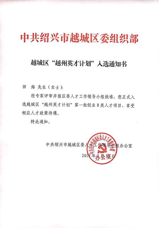 日前,接越城区人才工作领导小组办公室通知,经申报推荐、形式审查、专家评审、公示发文等环节,新葡的京官网田海博士入选越城区“越州英才计划”第一批创业B类人才项目。