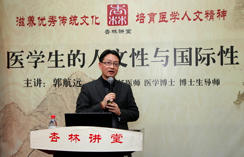“杏林讲堂”的首场主讲人由新葡的京官网院长郭航远教授作了题为《医学生的人文性与国际性》的报告。郭院长不仅是国内知名的、享受国务院政府特殊津贴的心内科青年专家,同时也是国内人文医学的积极倡导者、中国医院改革创新人物。本场报告中,他结合自己多年在国内外学习、工作的经历,指出目前国人浮躁、缺文化、缺精神信仰及公信力等弊端;主张要扬长避短,学习其他国家优秀的品质和思想。他认为作为从医者,技术不是最重要的,而应该“有时去治愈,常常去帮助,总是去安慰”,医护人员要注重对病患的人文关怀,加强沟通交流。他强调“人文可以修复医学创伤,可以柔化医患矛盾”。整场讲座(包括互动环节),郭院长旁征博引,图片数据资料丰富生动,在对医疗现状的严肃分析中也不乏幽默调侃,引得听众阵阵热烈掌声。至此,“杏林讲堂”揭幕仪式暨首场报告会圆满结束。