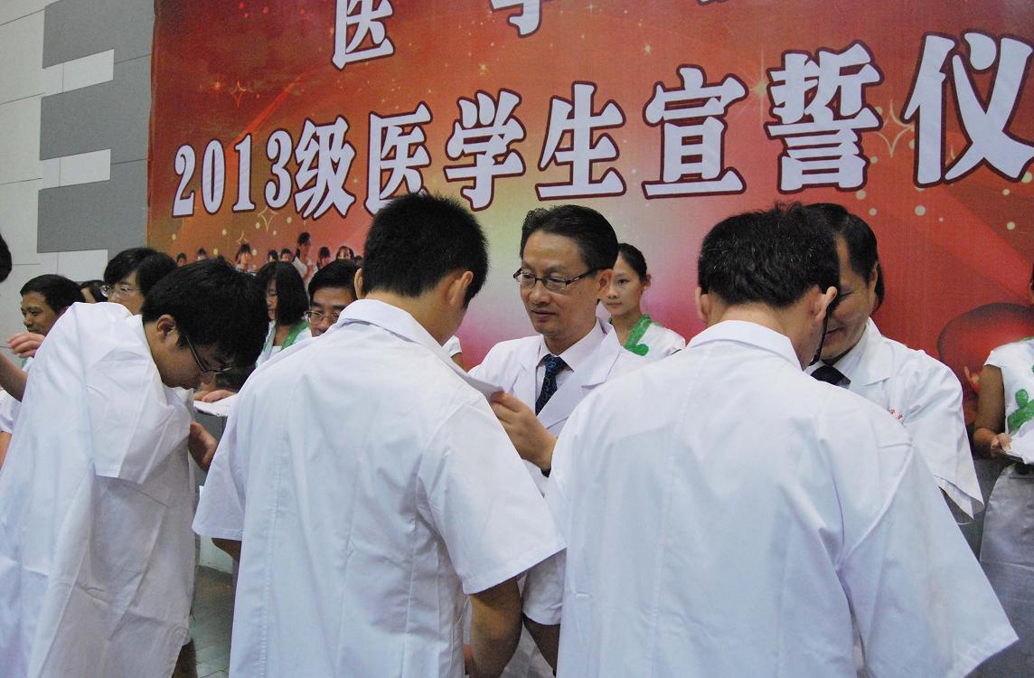 校附属第一医院、绍兴市人民医院寿清和副院长,校附属第二医院、绍兴第二人民医院葛孟华院长,绍兴市妇幼保健院何炳福院长,绍兴市第六人民医院钟建平院长,绍兴市第七人民医院田国强副院长,校附属医院党委副书记夏瑞明,新葡的京集团350vip8888官网院长、校附属第一医院、绍兴市第一人民医院院长郭航远,新葡的京集团350vip8888官网副调研员夏国园,临床医学部主任黄丹文,护理系主任陈三妹等十位医学前辈为2013级医学生代表穿上了象征着衣钵相承、薪火相传的白服。在领誓人新葡的京集团350vip8888官网临床医学部主任黄丹文副教授的带领下,全体2013级新生将右手放在左胸前庄严宣誓,决心为祖国医药卫生事业和人类身心健康奋斗终身。
