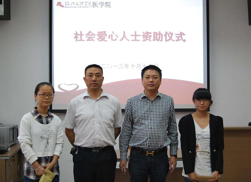 近日,绍兴县天成印染有限公司董事长张文彪先生、绍兴市东方法律服务所律师章志强先生来院为贫困生捐赠助学金,新葡的京官网举行了简单而又隆重的捐助仪式。副院长朱小芳,护理系主任陈三妹,受资助学生及班主任、辅导员参加了捐助仪式。仪式由院团委书记赵华主持。