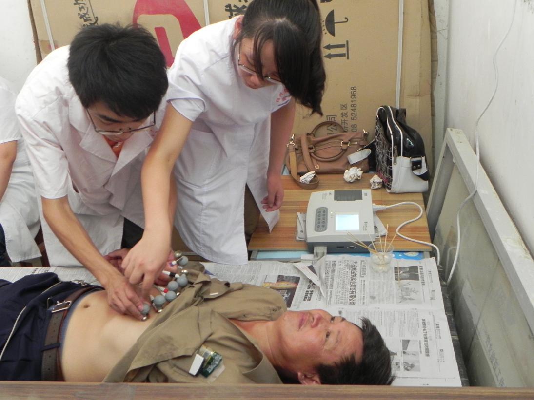 我们被分配到的第一个任务是跟随当地的卫生院医生们前往当地的一个小诊所参与体检工作。我们经过蜿蜒曲折的山路,一路颠簸来到了目的地,当天是个艳阳天,小诊所很简陋,只有我们两个寝室的大小,里面很闷热,没有空调,没有风扇,而门口早已经站满了等着体检的当地居民。看那居民们在诊所门口等待的情景,一股莫名的心酸涌上我的心头。这就是我们的实践地点,一个贫困的小山村,交通不方便的居民们平时根本没有什么时间去外面的正规医院做体检,就算身体不适很多也是草草包扎,用当地土方子治疗,他们没有精力,更没有钱去医治他们的病,就这么坐着等待病魔慢慢地啃食着他们的健康,榨干他们的血和汗!