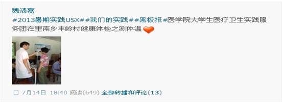 “把一件简单的事做好就是不简单,把一件平凡的事做好就是不平凡。”真情暖人心,感谢里南乡为我们的进步搭建了这个平台,让我们感受到不同地方的风土人情,感受这份不易与骄傲,给予我们进步的空间,为之规划轨迹。让我们更为深刻的知晓,作为医学生的我们,更是应该本着崇高的道德理想,服务他人,奉献他人,关爱他人,帮助他人,发扬医卫人员重情重义、大爱博爱的可贵品质,从小事做起,积极奉献,将雷锋精神与时代充分地结合起来,将志愿服务、实践服务推向一个新的高度!勿以恶小而为之,勿以善小而不为。只要是善事,哪怕再小,都值得歌颂。一个微笑,虽然短暂,却能感化冷漠;一句对不起,虽然简短,却能化解冲突;一声谢谢,虽然普通,却能显现温暖;一支笔,虽然细小,却能记录生活;一滴血,虽然渺小,却能拯救生命。不积跬步,无以致千里,不积小流,无以成江海。当无数人的鲜血汇聚一起时,便是爱心的海洋。一个人做一辈子善事太难太难了,但是做一件善事却是非常容易的。曾几何时,你发现你有能力帮助别人,但你的内心却还在挣扎,举棋不定时,那么请你抬着看看天空,就会明白:同一个世界,同一片蓝天,生活需要爱心,价值在于奉献。