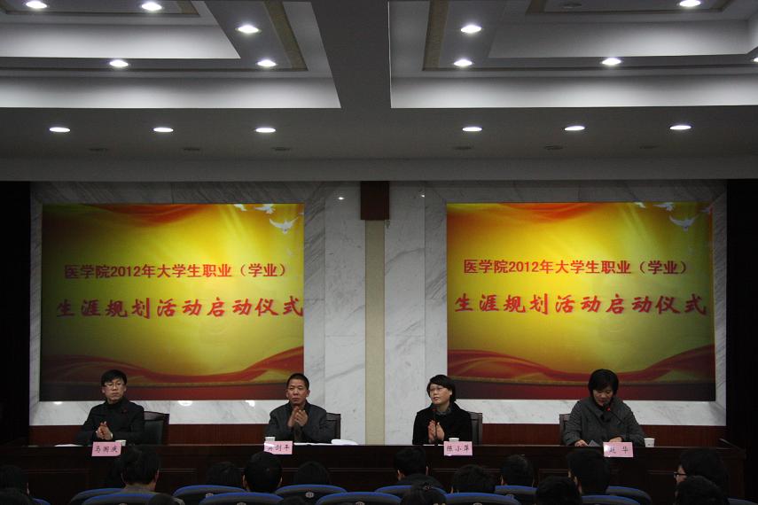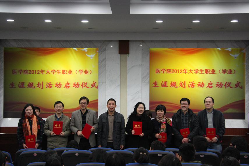 12月6日晚,2012年大学生职业(学业)生涯规划活动启动仪式在财贞楼学术报告厅隆重举行。院党委副书记吴剑平、教研科科长陈小萍、学生科副科长马国庆出席仪式并在主席台就坐。受聘导师、2012级各班班主任、辅导员和各班学生代表近180人参加了仪式。院团委书记赵华主持仪式。