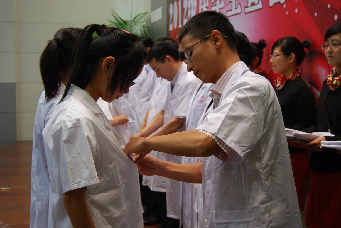 绍兴市中医院张居适院长,绍兴市第七人民医院楼正龙院长,校附属第一医院、绍兴市第一人民医院阎晓勤副院长,校附属第二医院、绍兴市第二人民医院谢垒副院长,绍兴市妇幼保健院方敏副院长,绍兴市第六人民医院方兴亮副院长,校附属医院党委副书记夏瑞明,新葡的京集团350vip8888官网副调研员夏国园,临床医学部主任黄丹文,护理系主任陈三妹,医学检验系主任刘丽华等十一位医学前辈为2012级医学生代表穿上了象征着衣钵相承、薪火相传的白服。在领誓人校附属医院副院长张宏卫教授的带领下,全体2012级新生将右手放在左胸前庄严宣誓,决心为祖国医药卫生事业和人类身心健康奋斗终身。