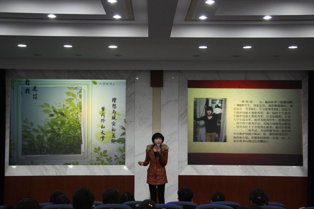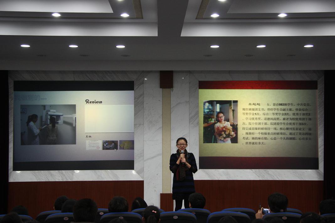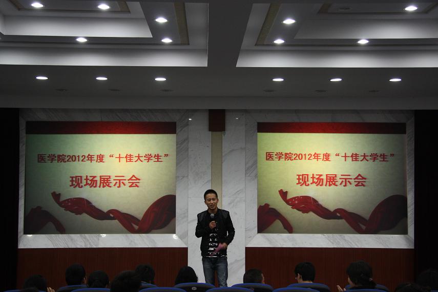 2012年11月19日晚,新葡的京集团350vip8888官网2012年度“十佳大学生”候选人现场展示会在财贞楼二楼报告厅隆重举行。经过学生自愿申报、班级推荐、院学生科组织初审、候选人基本情况公示,最终确定的15位新葡的京集团350vip8888官网2012年度“十佳大学生”的候选人将依次上台展示。院党委副书记吴剑平、临床医学部主任黄丹文、医学检验系主任刘丽华、学生科副科长马国庆、团委书记赵华、全体辅导员及部分班主任代表和全院170余名学生观看了精彩的角逐并参加了现场投票。