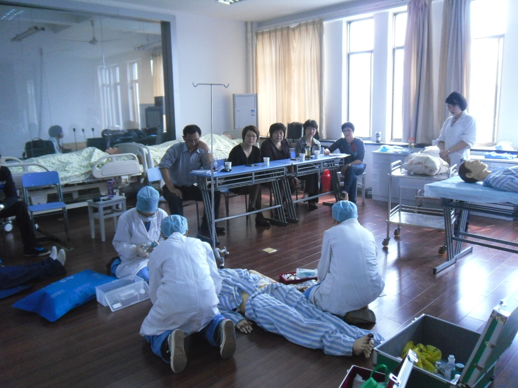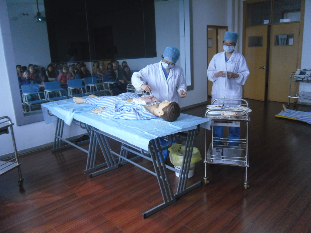 在积极总结前次模拟竞赛不足的基础上,通过强化训练,此次模拟竞赛,参赛选手操作技能又有新的提高。本次模拟竞赛较前次有2个“亮点”:一是考核了集体操作项目,检验了参赛选手间的协作能力;二是模拟竞赛实况转播,在演播室观摩的临床08级、09级学生受到了很好的启发。