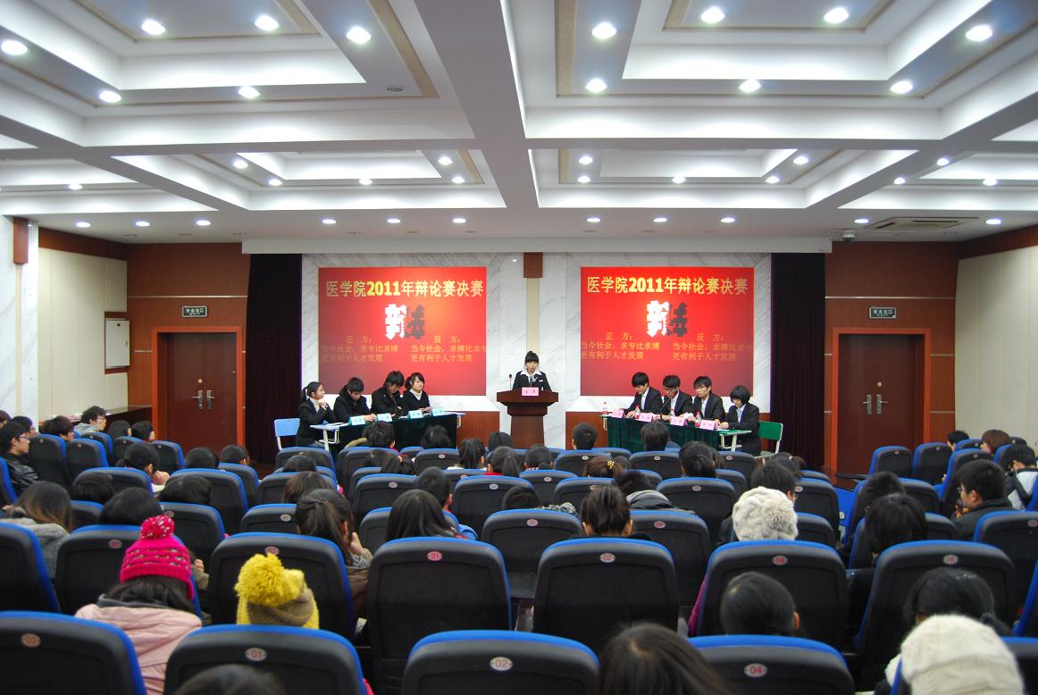 12月15日下午,新葡的京集团350vip8888官网2011年度辩论赛总决赛在财贞楼二楼报告厅举行,临床医学部主任黄丹文老师,护理系主任陈三妹老师,医学检验系主任刘丽华老师,学生科副科长马国庆老师和团委书记赵华老师担任评委。辩论赛由学生会学习部部长赵佳慧主持。