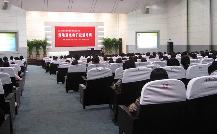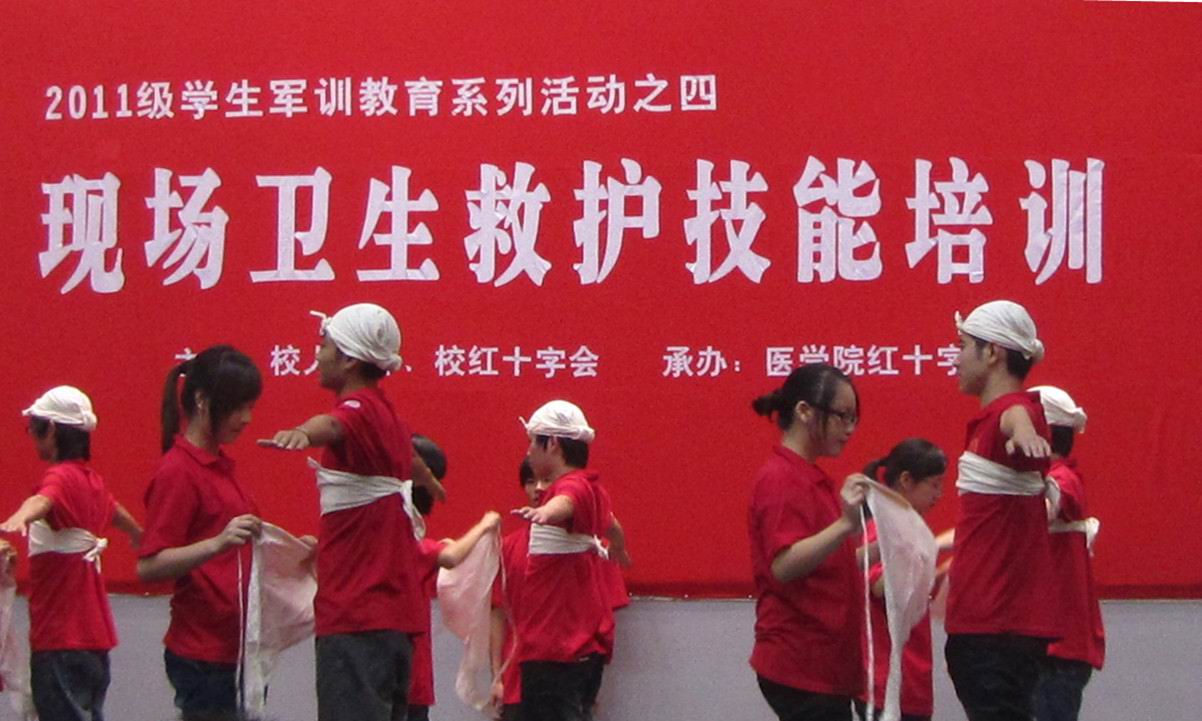10月14日晚,新葡的京官网红十字会承办的2011级同学军训教育系列活动之四——现场卫生救护技能培训在铁城科教馆隆重举行,2011级军训连队抽调的400名同学接受了培训。