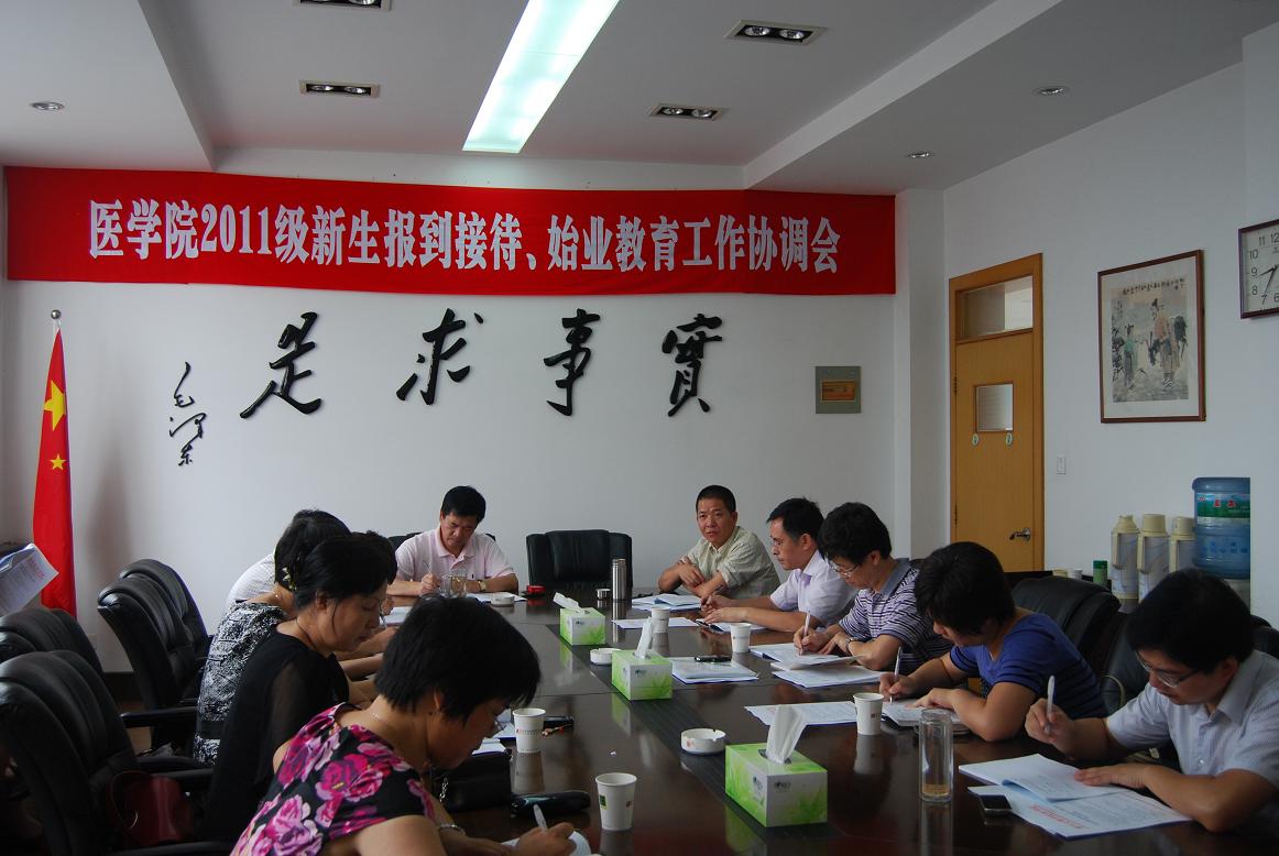 吴剑平副书记简要介绍了2011年学校和新葡的京官网各专业新生录取的总体情况,并就新生接待工作从组织保障、总体目标、具体安排、注意事项等四个方面做了具体部署;就始业教育工作从指导思想、教育目的、时间及形式、教育内容、组织领导和工作要求等方面做了具体说明和安排。