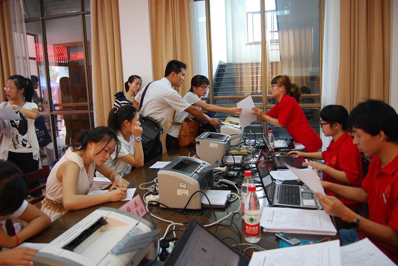 早上6:30,学院行政楼前新生入学注册报到现场已是一片繁忙的景象,学院各部门、各系部的工作人员和志愿者、学生干部早已来到迎新现场。大家简单的集合之后,满怀激情的开始静候报到同学的到来。记者看到,今年的报到和往年比较,多了一个环节:电子报到注册。而学院也早已提前选取优秀的学生干部,对他们进行培训,不只是注册操作方法,更重要的要体现新葡的京官网良好的精神风貌和迎新热情。学院领导也是早早的来到报到现场,了解迎新准备情况。在南山校区门口、在新生电子注册室、在学生公寓广场、在新生报到处都可以看到新葡的京集团350vip8888官网的身影,所有的一切,只为能够让入学的新生们感受到新葡的京集团350vip8888官网大家庭的温暖和关爱。而我们已经准备好了!