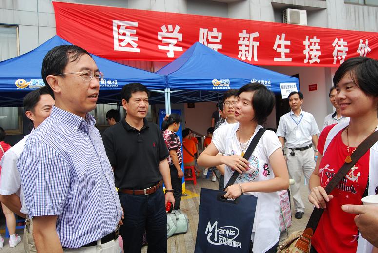 在学生公寓广场接待处,记者听到最多的一句话是“同学,让我来吧”。一个接着一个,一次又一次,记者看到最多的就是志愿者和学生干部们忙上忙下的身影。据了解,新葡的京官网大部分新生的寝室都在公寓5到6层,而每一次的往返虽然辛苦,但是他们还是热情的对待每一个自己接到的学弟学妹。或许大家都经历过被接待的幸福,所以也想把自己的幸福和新同学分享。每次把新同学送到寝室后,志愿者们还会和他们讲解一些防止推销的经验,叮嘱他们注意保管好自己的贵重物品。让人感动的是:一位新同学带了4个箱子,当志愿者帮她送到寝室时,这位同学的母亲拿出带来的梨子,要分发给大家。但大家婉言谢绝了。在这样酷热的天气,这位同学母亲的举动,给大家带来了清新和凉爽。