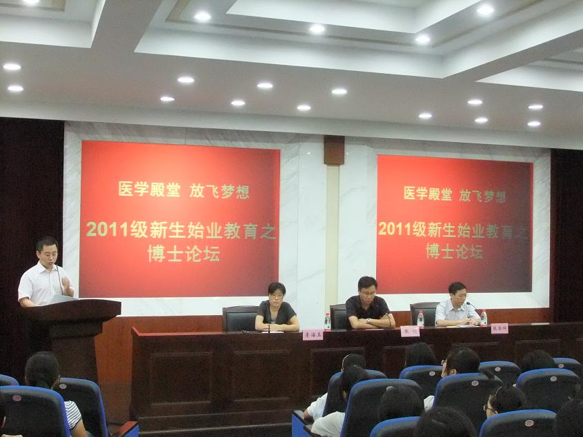 博士论坛首先由三位博士分别向在座的2011级新同学作主题讲演。张登科博士从自己的求学经历、大学学习规律和学习态度、人际关系协调等几个方面谈了自己的想法,并特别从自己的经验教训告诫大家一定要转变认识,端正态度。张剑博士和大家一起分享了他对大学范畴、大学特点、大学学习和做人等方面的见解,他特别从我校“修德求真”的校训,分析了作为医学生追求真理和注重培养文化道德素养的重要性。李海玉博士从自己求学过程中的点点滴滴向大家阐明了进入大学应该以学习为主,兼顾其它,慢慢积累资本,厚积薄发。同时她还谈了对学生考研、考博以及如何处理学习、工作和生活三者关系的看法。