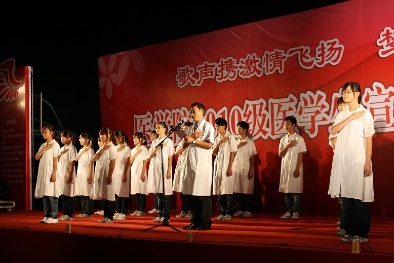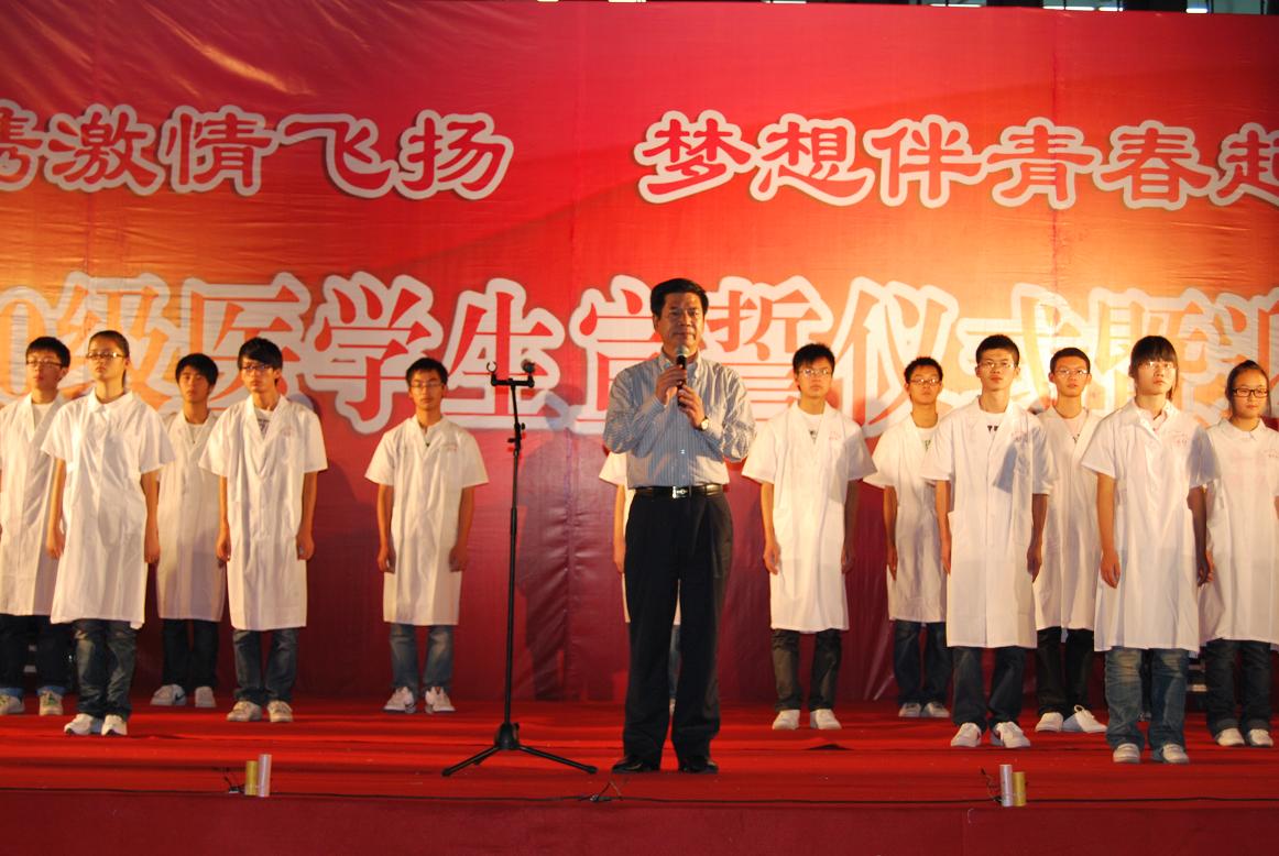 宣誓结束后,新生代表赵鹏飞同学上台发言,表达了2010级全体医学生将在医学学府中刻苦钻研,精益求精的决心。授服教授代表校附属第二医院毛中萍院长在讲话中重申了医务工作者的重大责任,并带领全体师生重温了希波克拉底誓言。校党委委员、院党委书记叶访春代表学院党政领导班子和全体教职工向新生表示最热情的欢迎及最真诚的祝福。他在讲话中运用著名的“二八理论”,阐述如何赢得病人及其家属的信任;对在院任职老师提出了“学着孔子那样做老师”的建议,以拉近师生间的距离;对2010级新生提出了“端庄自己的脸,精湛自己的医术”的要求,以鼓励新生励志求学,奋发向上。