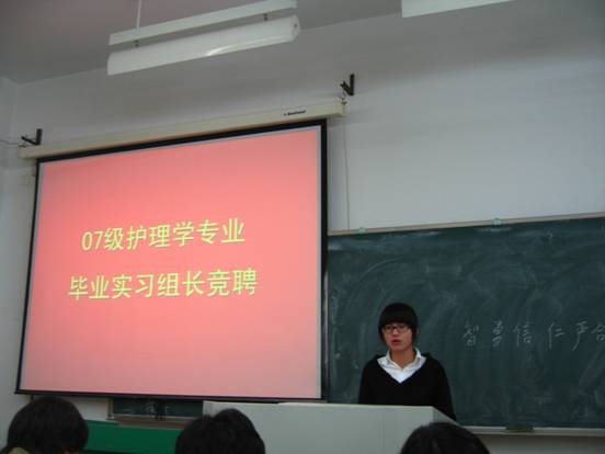 上周末晚,财贞楼205教室灯火通明,掌声阵阵。这里正在举行护理学专业毕业实习前系列活动之毕业实习组长竞聘会,这是护理学专业第一次尝试以竞选的方式选出毕业实习组长人选。活动一推出即得到了同学们的热烈响应,共有来自07级护理学专业的25名优秀同学报名参加,她们将通过三分钟的竞聘演讲,角逐11家实习医院的实习组长之职。竞聘会特别邀请了教研科黄丹文副科长、护理系陈三妹主任、陈小萍副主任、辅导员胡晓琳老师以及刚结束实习的06级护理学专业各大医院部分实习组长担任评委。