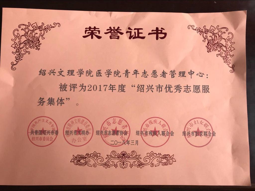 新葡的京官网青年志愿者管理中心荣获2017年度“绍兴市优秀志愿服务集体”。