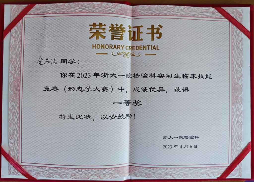 祝贺医学检验技术191班金苏洁同学在浙大一院实习生临床技能竞赛(形态学大赛)中获得一等奖。